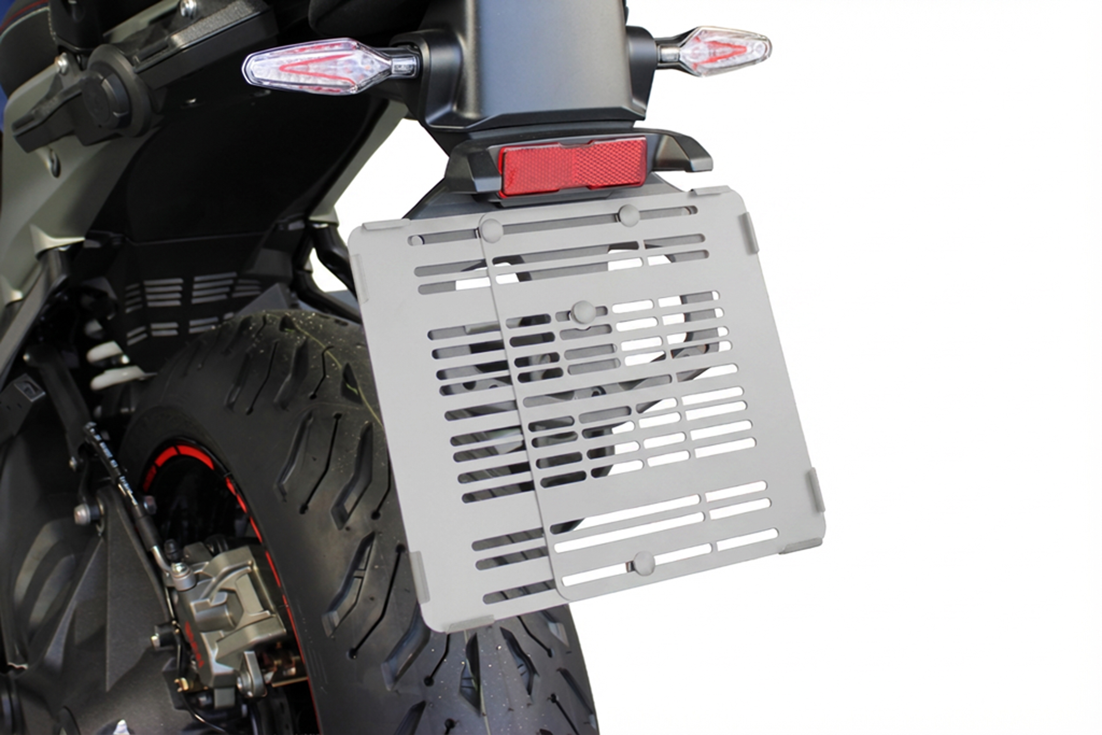 リア周りのクリアなラインを実現するために、柔軟に調整可能な可変ナンバープレートホルダーを採用しています。エンジンマウントのオープンチューブ用カバーは、これまで露出していた部分も調和させて統合します。